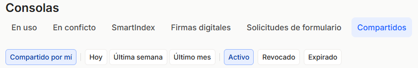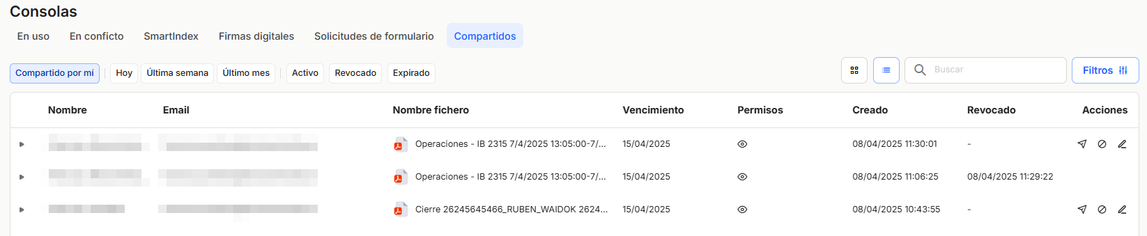 Compartidos. Muestra los documentos que tenemos compartidos, con qué correo electrónico, desde y hasta cuándo, y el estado de la compartición. Desde esta consola también podremos Notificar de nuevo la compartición del documento con el destinatario, revocarla o editar las características de la acción de compartir.